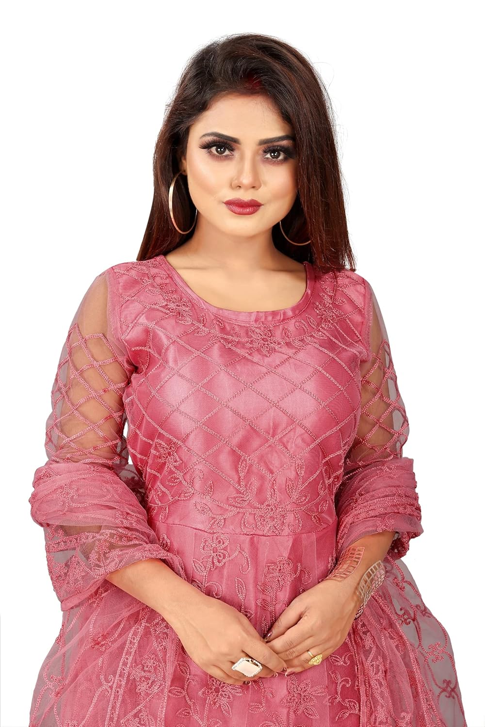 Fabric: Net, Work : Chain Stitch Embroidered, Gown is Comes With Inner and Dupatta Available 2.20 Meter.Gown Length is 57 Inch. It has 3/4 Sleeves with Embroidered Work. Gown is Semi-Stitched which can be fitted up to 44 inch Bust Size. Dry Clean Or Normal Hand Wash. Product Color May Slightly Variation Due To Photographic Lighting Or Your Screen Settings And Other Accessories Are Only Modelling Purpose.
